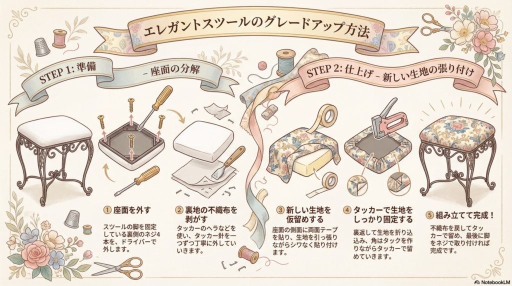 【DIYで楽しむインテリア】エレガントアイアンスツールを美しい生地でグレードアップ♪