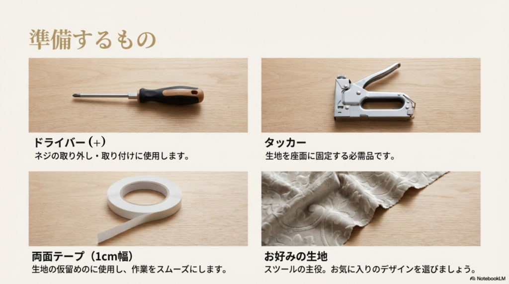 このスツールは、タッカーと+ドライバーさえあればOK!