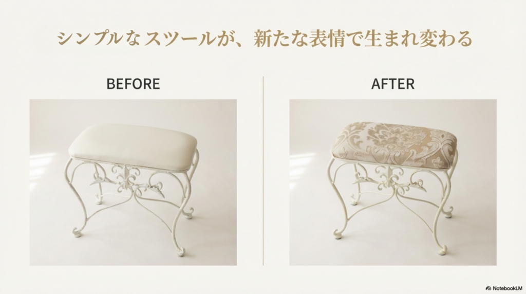 【DIYで楽しむインテリア】エレガントアイアンスツールを美しい生地でグレードアップ♪