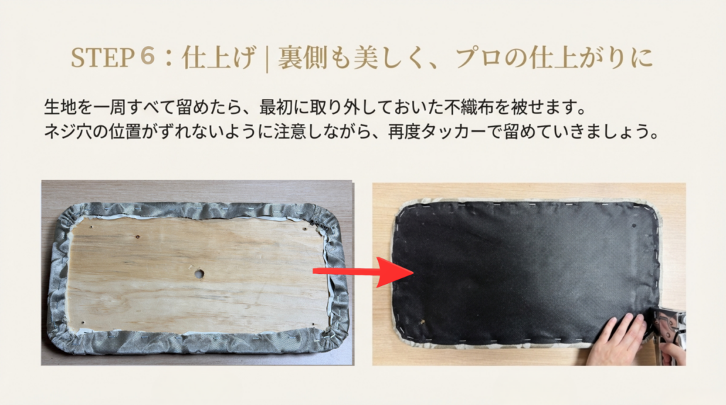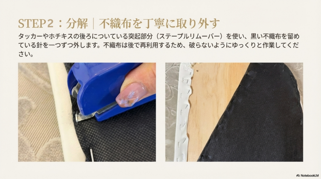 - 裏に留め付けて有る不織布を剥がす(タッカー芯を外す)