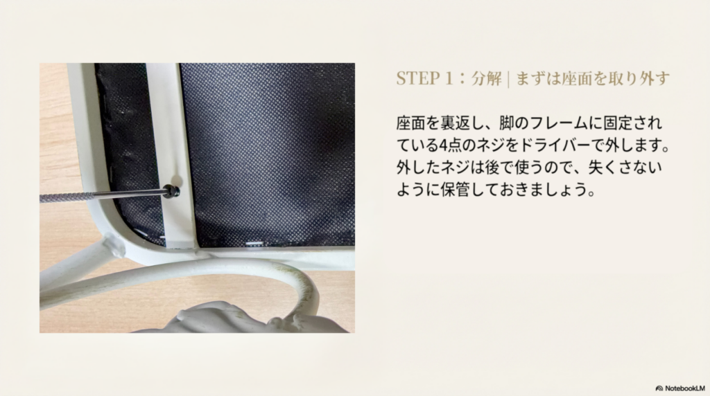 - 座面を取り外す(+ドライバーでネジ4本を外す)